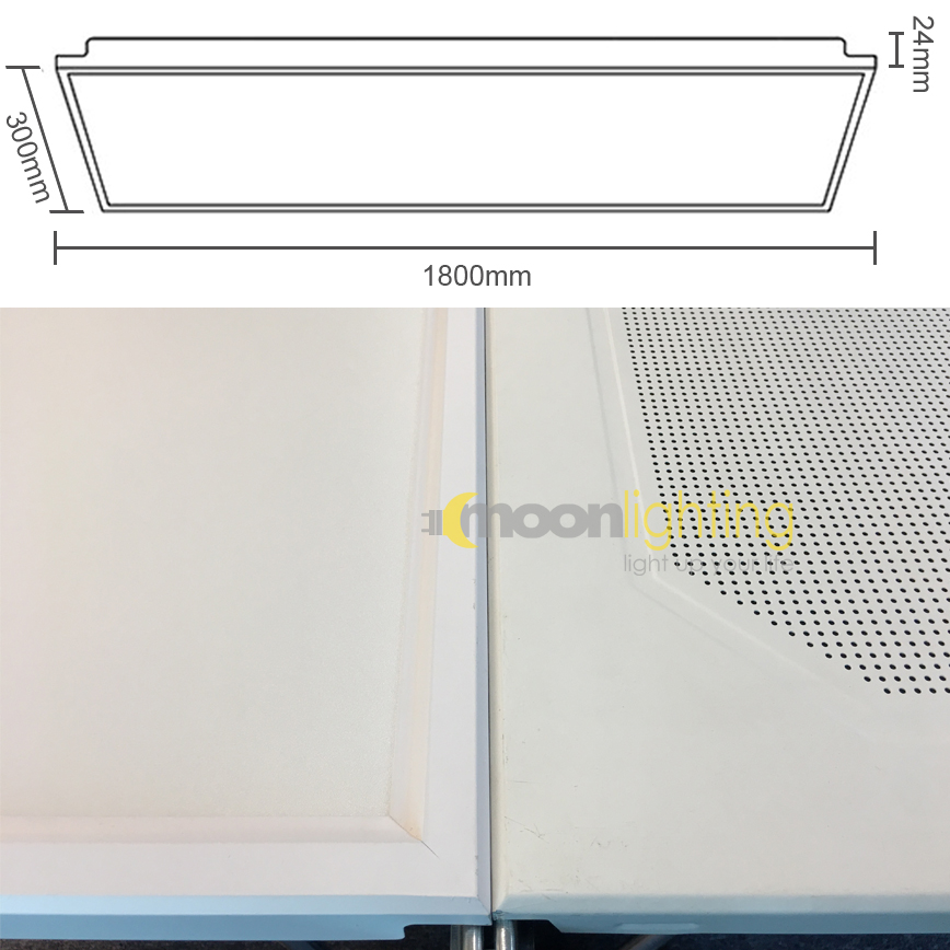 - Kích thước hèm sập của Đèn LED Panel Clip in 300x1800 cho trần nhôm chiều cao 24mm, bằng với chiếu cao hèm sập của Tấm Panel trần nhôm Clip-in. Do vậy khi thi công mặt đèn và mặt trần nhôm clipin sẽ bằng phằng, không bị lõm xuống như loại Đèn LED Panel thông thường.