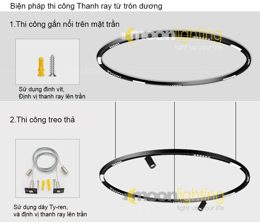 - Thanh ray từ tròn dương với 2 biện pháp thi công gồm: Thi công thanh ray từ tròn treo thả sử dụng tyren, Thi công thanh ray từ tròn gắn lên bề mặt của trần thạch cao